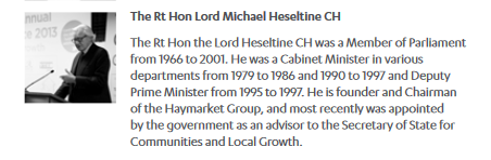Heseltine Infrastructure CommissionTurn now to Osborne’s National Infrastructure Commission itself. Who does one find adorning the ranks of its Commissioners? Why, none other than ……. Michael Heseltine.