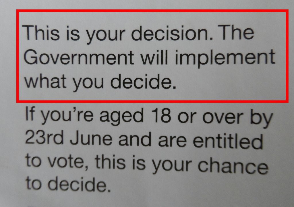 ref-leaflet-contract-with-the-votersFor this particular issue of Britain’s EU membership, Parliament gave back to the people the sovereignty which we temporarily lend it. It said, in effect: “this is for you to decide, not us on your behalf”. It even emphasised as much – “The Government will implement what you decide” – on its information leaflet.