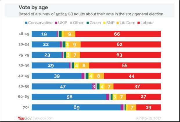 The young’s voting patterns in recent election results certainly seem to bear this out. The YouGov analysis of voting by age group in the 2017 General Election shows that, in all three age-groups spanning the ages from 18 to 29, the Labour vote was over 60%.